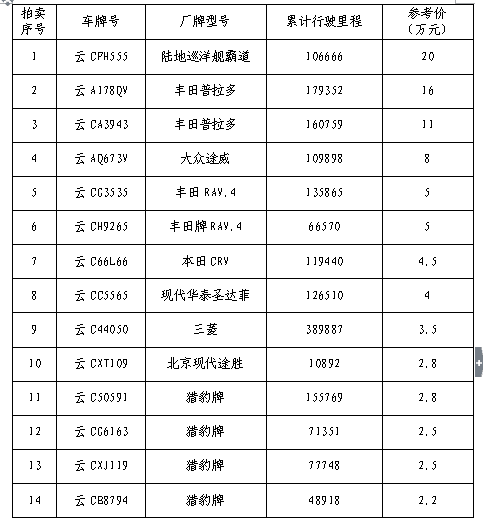 經(jīng)鎮(zhèn)雄縣人民政府批準(zhǔn),受鎮(zhèn)雄縣國有資產(chǎn)管理局委托,公開拍賣鎮(zhèn)雄縣公車20輛。以輛為單位拍賣。相關(guān)事項(xiàng)如下: